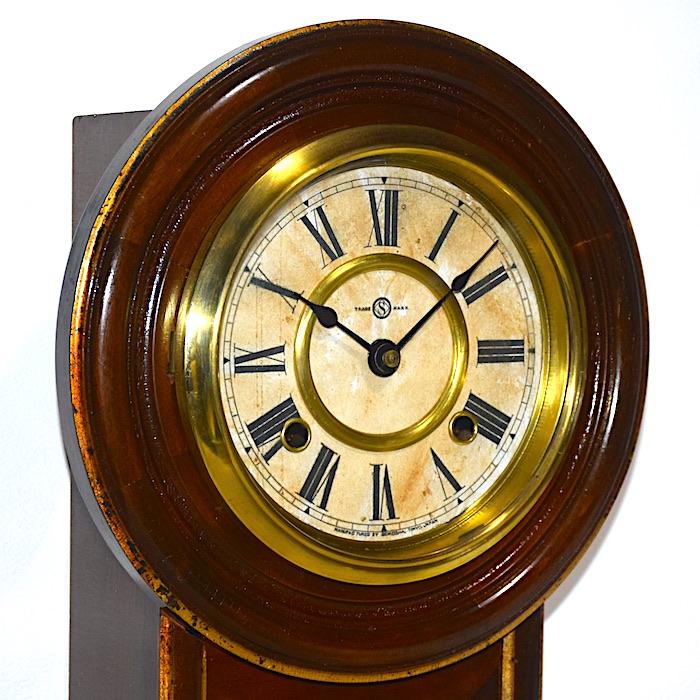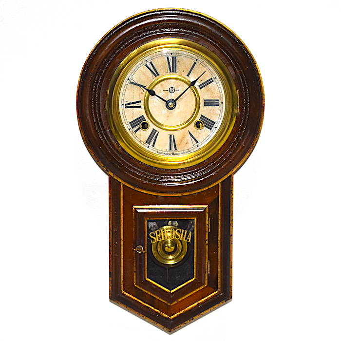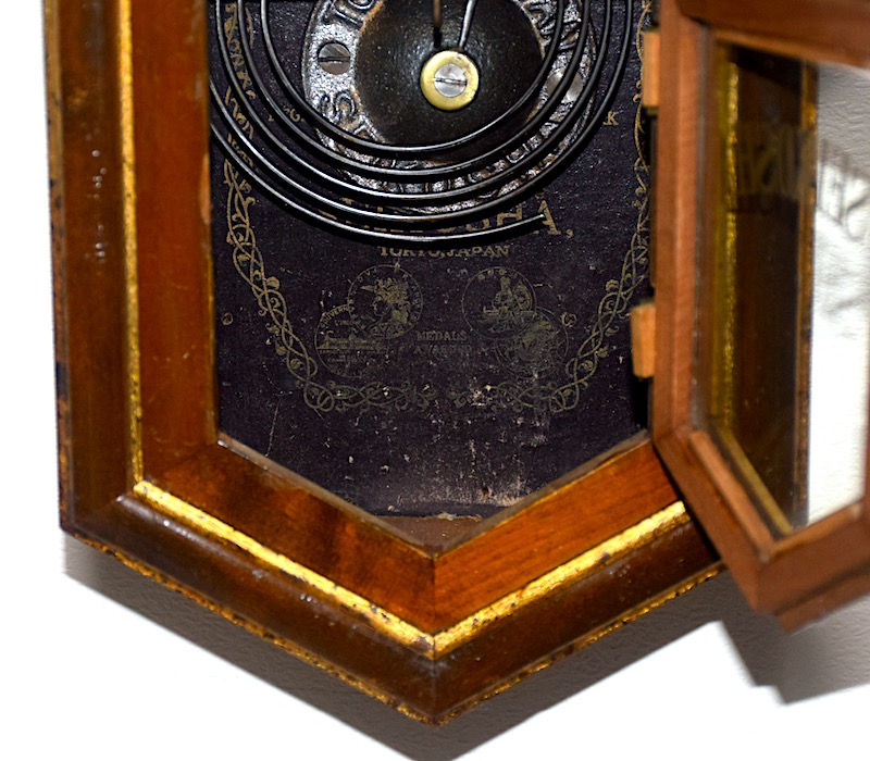 振子室内のラベル(画像5枚目)は黒地金彩のメダル4枚のラベルです。これは『ハノイ万国博覧会(1902〜1903年/明治35〜36年)』及び『東京勧業博覧会(1907年/明治40年)』でそれぞれ金賞を受賞した記念のメダルを表した物なので、こちらの時計の製造年は明治40年代頃と判ります。