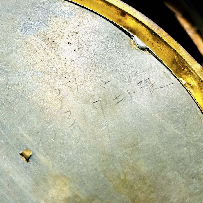 文字盤の直径はやや小さめの八吋(8inch=約20cm)で、オリジナルのローマ数字で手描きペイントの物からアラビア数字の補修用の物(紙製)に代わっています。