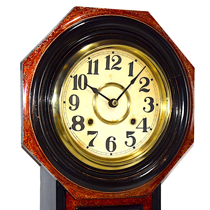 こちらの柱時計は文字盤の周りを八角形の木枠で囲み、その下に長めの振り子が入る箱(振り子室)がつく『八角尾長』という当時の標準的な形状で、その中でも『兵庫』と呼ばれるやや珍しいタイプです。