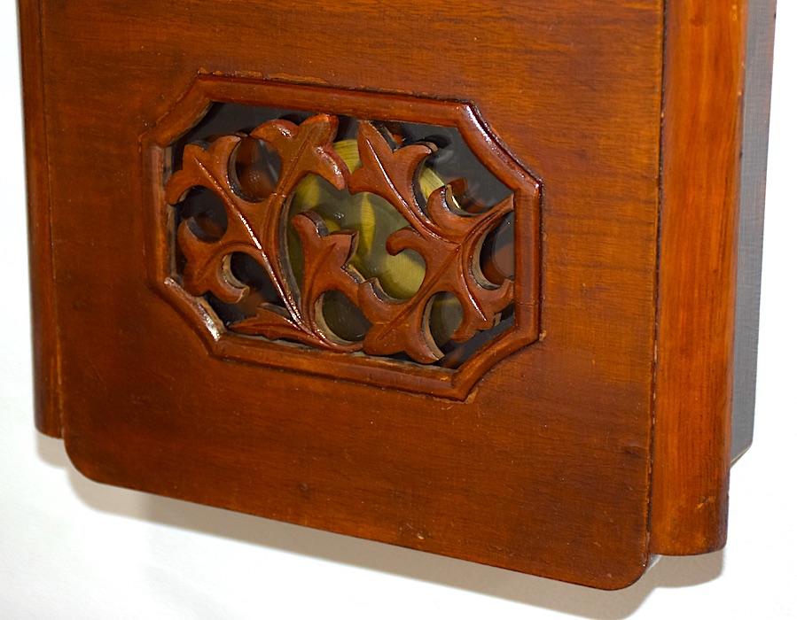 八角形の振り子室の窓は全体に植物の葉のような装飾で覆われ、その隙間から左右に動く振り子が見え隠れするというとても個性的な意匠で、大正時代末〜昭和初期頃のレトロモダンな雰囲気を感じさせる一品です。