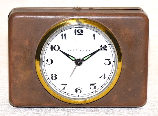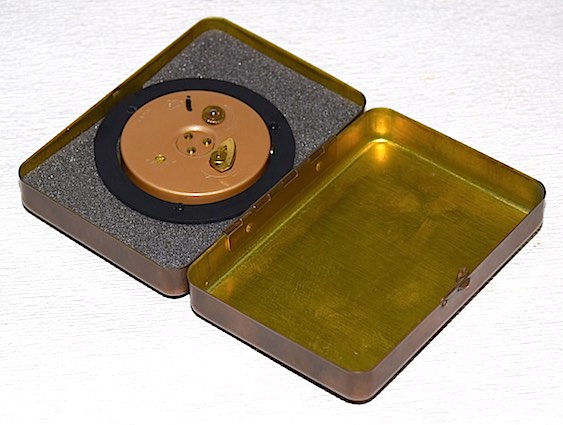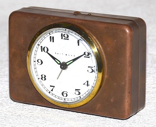 金属(おそらく真鍮)製のボックスに小さな時計が付いた、変わった形状の一品です。